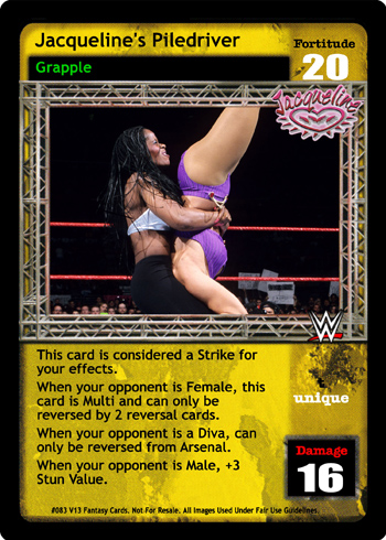 This card is considered a Strike for your effects. When your opponent is Female, this card is Multi and can only be reversed by 2 reversal cards. When your opponent is a Diva, can only be reversed from Arsenal. When your opponent is Male, +3 Stun Value.