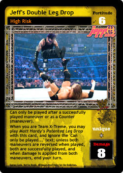 Can only be played after a successfully played maneuver or as a Counter (maneuver). When you are Team X-Treme, you may play Matt Hardy's Patented Leg Drop with this card, and ignore the 'Can only be played...' text; unless both maneuvers are reversed when played, both are successfully played, and when damage is applied from both maneuvers, end your turn.