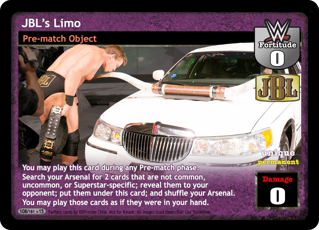 You may play this card during any Pre-match phase. Search your Arsenal for 2 cards that are not common, uncommon, or Superstar-specific; reveal them to your opponent; put them under this card; and shuffle your Arsenal. You may play those cards as if they were in your hand.
