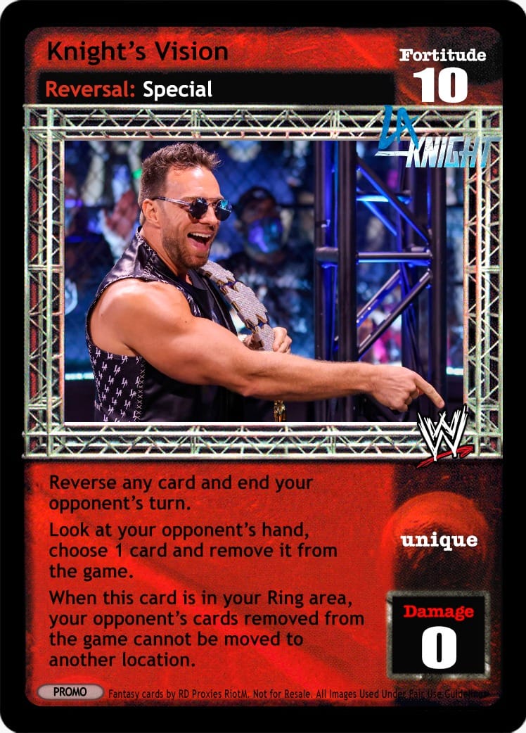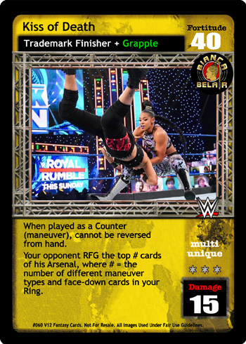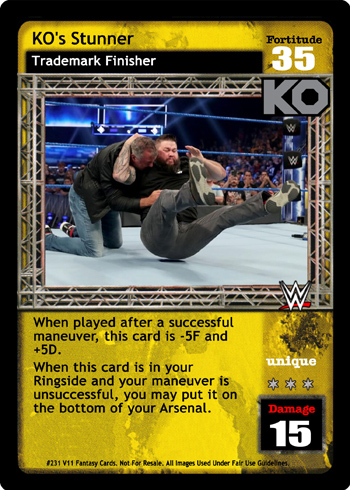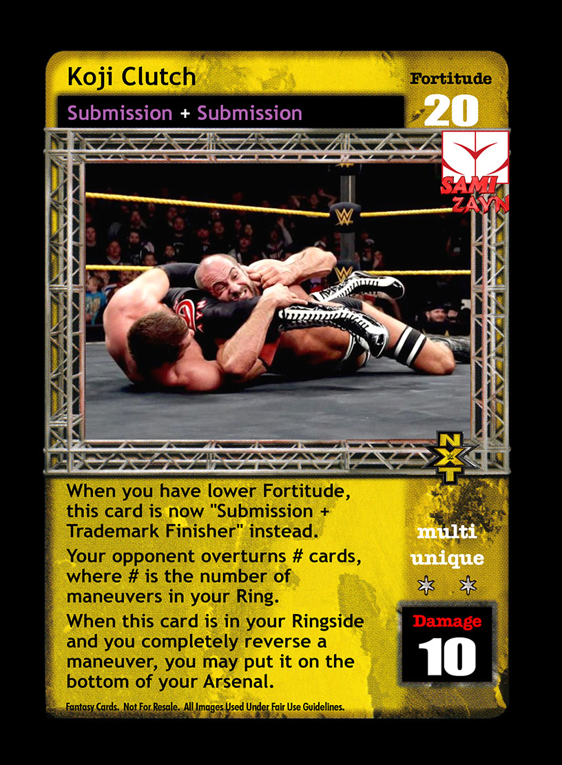 When you have lower Fortitude, this card is now 'Submission + Trademark Finisher' instead. Your opponent overturns # cards, where # is the number of maneuvers in your Ring. When this card is in your Ringside and you completely reverse a maneuver, you may put it on the bottom of your Arsenal.