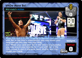 When this card is in your Ringside or Backlash and your card with 'bo' in the title is unsuccessful, you may reveal your hand and put this card into your Ring. ACE: When your card with 'bo' in the title is unsuccessful, you may search your Arsenal for 1 card with 'bo' in the title, reveal it, put it into your hand, shuffle, and then reveal your hand.