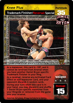 As a maneuver, this card is -10F, and it cannot be reversed from Arsenal when you have another Daniel Bryan-specific Trademark Finisher in your Ring. As a reversal, reverse any Activated Card Effect or non-maneuver card, and your opponent discards 3 random cards. During your turn when this card is in your hand, you may discard it and shuffle 1 Daniel Bryan-specific maneuver from your Ringside or removed from the game into your Arsenal.