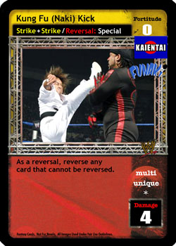 When packing this card, you can pack Don't Try This at Home and Don't be a Douchebag!, and your cards with 'Funaki' in the title are Superstar-specific and can be packed as if they are not Face or Smackdown; but you cannot pack Corners. Your opponent cannot reverse the effect of the first card you Activate each turn with 'Funaki' in the title. When your maneuver or Funaki-specific action is unsuccessful and you have lower Fortitude, you may discard 1 reversal, and then he reveals his hand, choose 1 card, and he discards the chosen card.