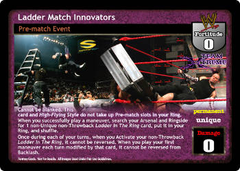 Cannot be blanked. This card and High-Flying Style do not take up Pre-match slots in your Ring. When you successfully play a maneuver, search your Arsenal and Ringside for 1 non-Unique non-Throwback Ladder In The Ring card, put it in your Ring, and shuffle. Once during each of your turns, when you Activate your non-Throwback Ladder In The Ring, it cannot be reversed. When you play your first maneuver each turn that is modified by that card, it cannot be reversed from Backlash.