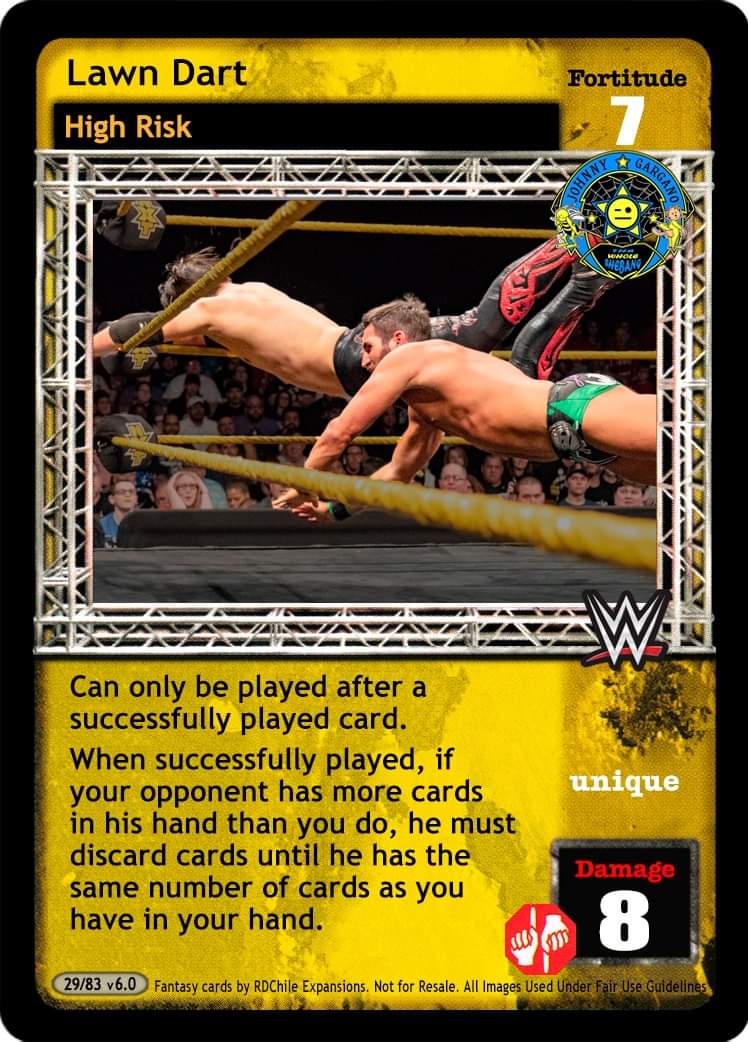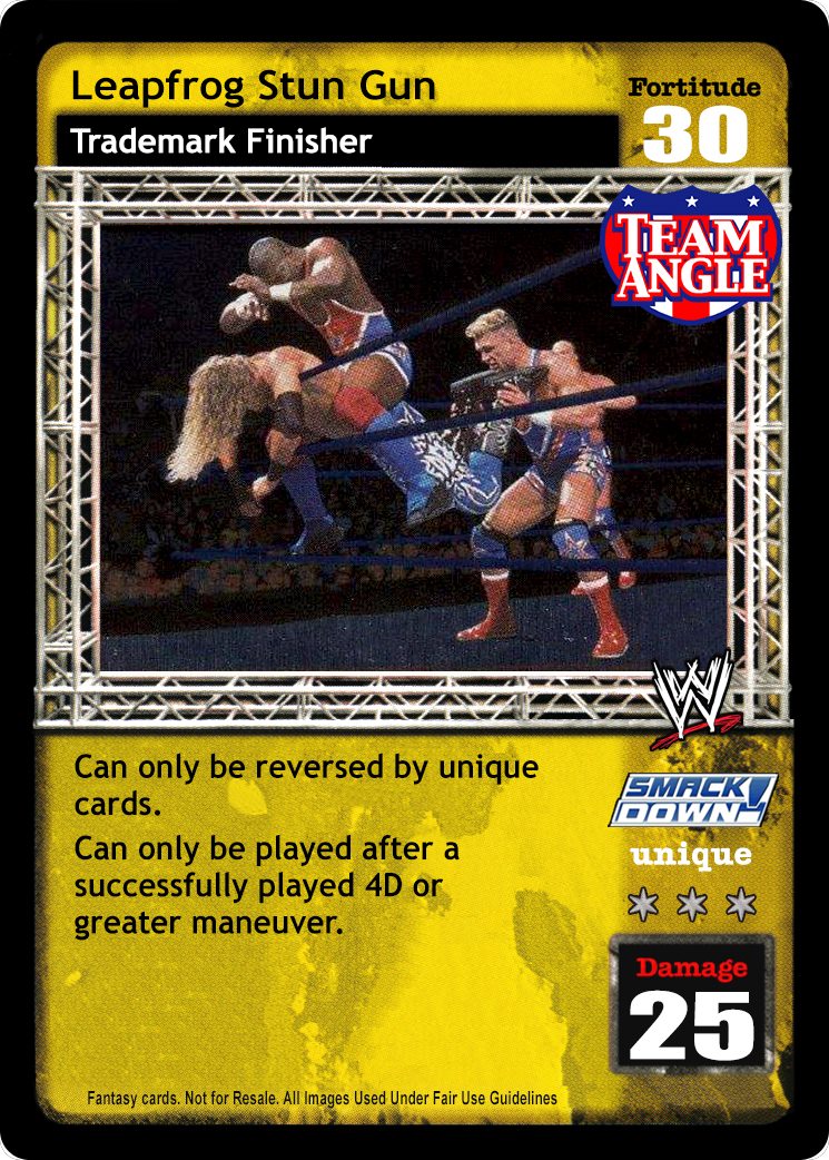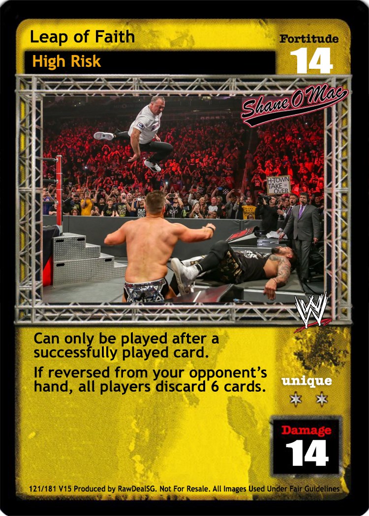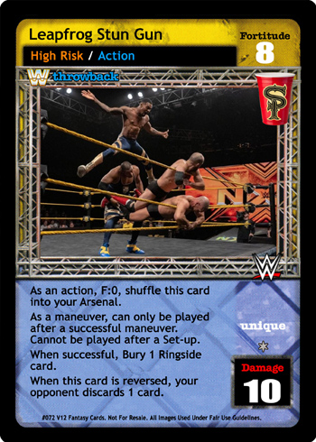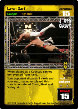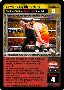Cannot be reversed by No Sell Maneuver. As a maneuver, when unsuccessfully played, put this card into your hand instead. As a reversal, when you have lower Fortitude, or your opponent is Michael Cole or Jack Swagger, reverse any Strike or Action card. When successfully played and your next card played is The Straps Are Down, he cannot respond to it it.