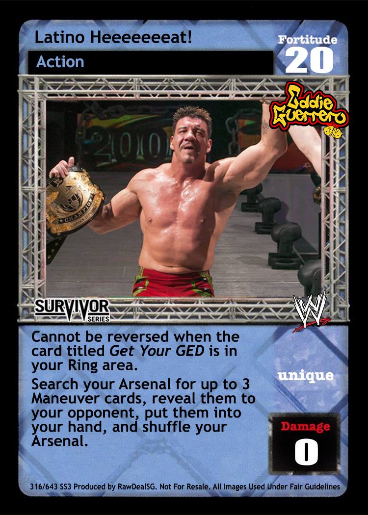 Cannot be reversed if the card titled Get Your GED is in your Ring area. Search your Arsenal for up to 3 Maneuver cards, reveal them to your opponent, put them into your hand, and shuffle your Arsenal.