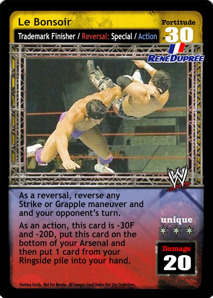 As a reversal, reverse any Strike or Grapple maneuver and end your opponent's turn. As an action, this card is -30F and -20D, put this card on the bottom of your Arsenal and then put 1 card from your Ringside pile into your hand.
