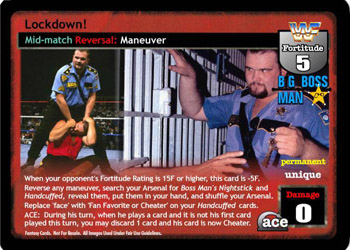 When your opponent's Fortitude Rating is 15F or higher, this card is -5F. Reverse any maneuver, search your Arsenal for Boss Man's Nightstick and Handcuffed, reveal them, put them in your hand, and shuffle your Arsenal. Replace the 'face' text with 'Fan Favorite or Cheater' on your Handcuffed cards. ACE: During his turn, when he plays a card and it is not his first card played this turn, you may discard 1 card and his card is now Cheater.
