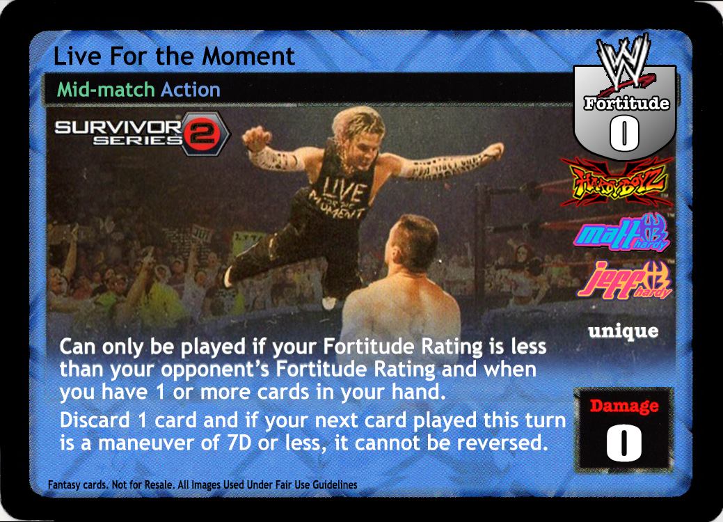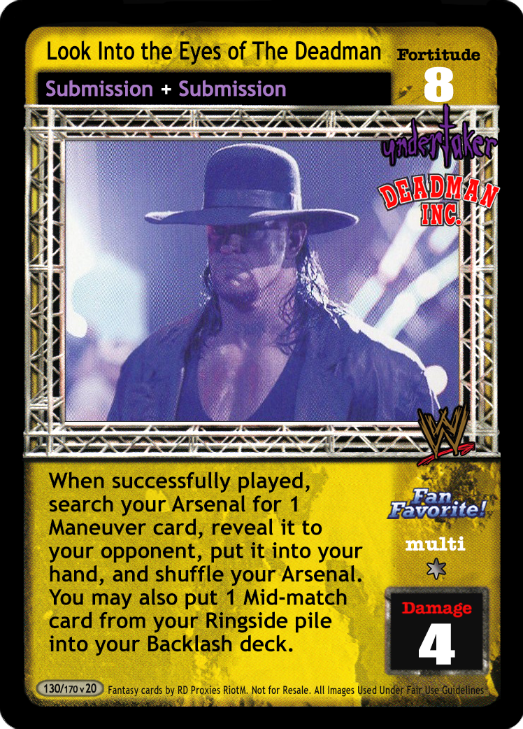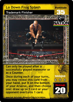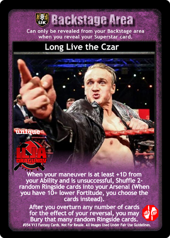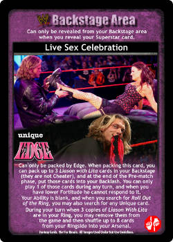 Can only be packed by Edge. When packing this card, you can pack up to 3 Liason with Lita cards in your Backstage (they are not Cheater), and at the end of the Pre-match phase, put those cards into your Backlash. You can only play 1 of those cards during any turn, and when you have lower Fortitude he cannot respond to it. Your Ability is blank, and when you search for Roll Out of the Ring, you may also search for any Unique card. During your turn when 3 copies of Liason With Lita are in your Ring, you may remove them from the game and then shuffle up to 8 cards from your Ringside into your Arsenal.
