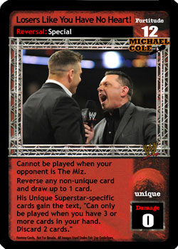 Cannot be played when your opponent is The Miz. Reverse any non-Unique card and draw up to 1 card. His Unique Superstar-specific cards gain the text, 'Can only be played when you have 3 or more cards in your hand. Discard 2 cards.'
