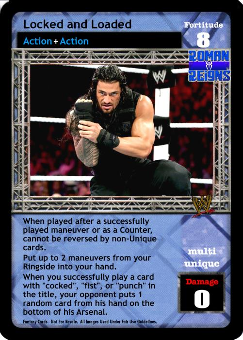 When played after a successfully played maneuver or as a Counter, cannot be reversed by non-Unique cards. Put up to 2 maneuvers from your Ringside into your hand. When you successfully play a card with 'cocked', 'fist', or 'punch' in the title, your opponent puts 1 random card from his hand on the bottom of his Arsenal.