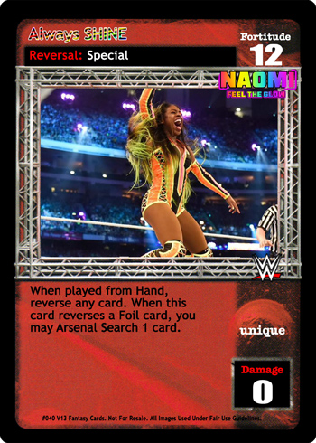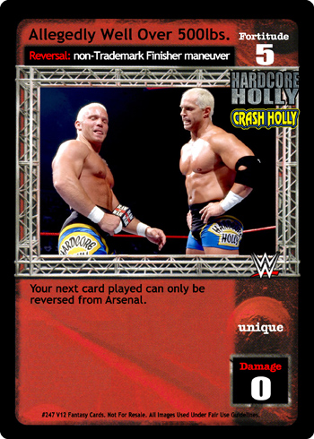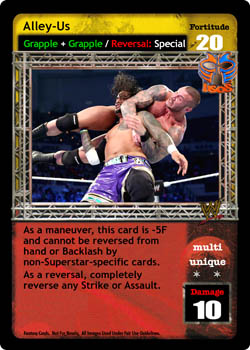 As a maneuver, this card is -5F and cannot be reversed from hand or Backlash by non-Superstar-specific cards. As a reversal, completely reverse any Strike or Assault.