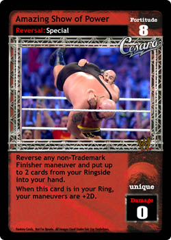 Reverse any non-Trademark Finisher maneuver and put up to 2 cards from your Ringside into your hand. When this card is in your Ring, your maneuvers are +2D.