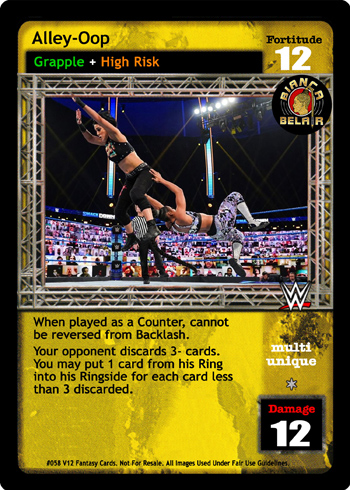 When played as a Counter, cannot be reversed from Backlash. Your opponent discards 3- cards. You may put 1 card from his Ring into his Ringside for each card less than 3 discarded.