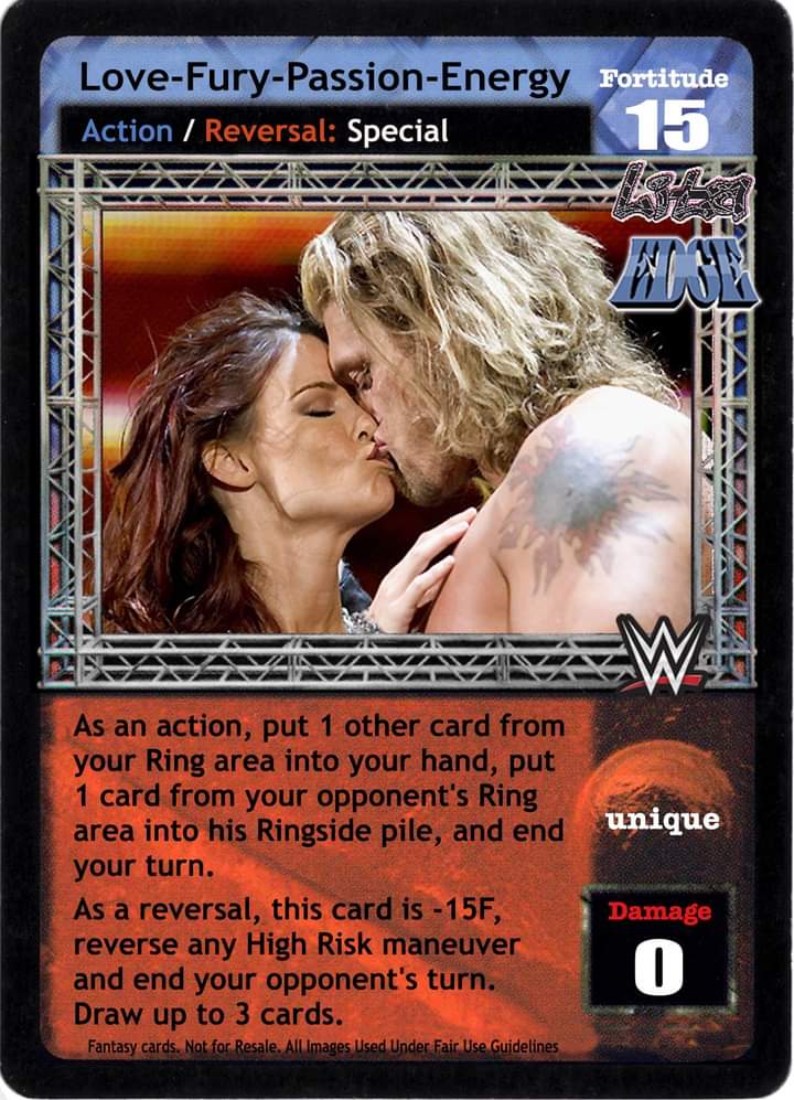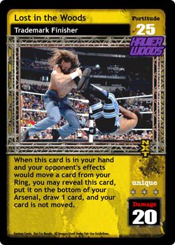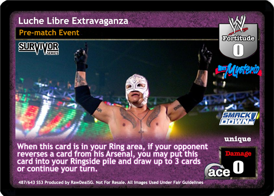 As a maneuver, when you have lower Fortitude, this card is F: 0 and when you have 5+ lower Fortitude, it cannot be reversed from hand or Ringside by non-Unique reversals; your opponent discards 2 cards. As an action, put this card on the bottom of your Arsenal and put 2 non-reversal maneuvers from your Ringside into your hand.