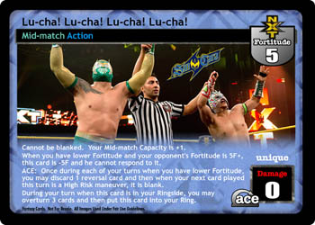 Cannot be blanked. Your Mid-match Capacity is +1. When you have lower Fortitude and your opponent's Fortitude is 5F+, this card is -5F and he cannot respond to it. ACE: Once during each of your turns when you have lower Fortitude, you may discard 1 reversal card and then when your next card played this turn is a High Risk maneuver, it is blank. During your turn when this card is in your Ringside, you may overturn 3 cards and then put this card into your Ring.