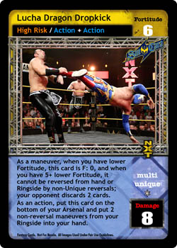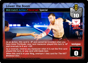As an action, this card is -4F and cannot be reversed when you have lower Fortitude. Your next maneuver played this turn is -6F and reversals to it are +10F. As a reversal, reverse any maneuver when it is not the first card played this turn, or any card with blank text. When this card is in your Ring, overturn 1 less card for The NXT Breakout Star.