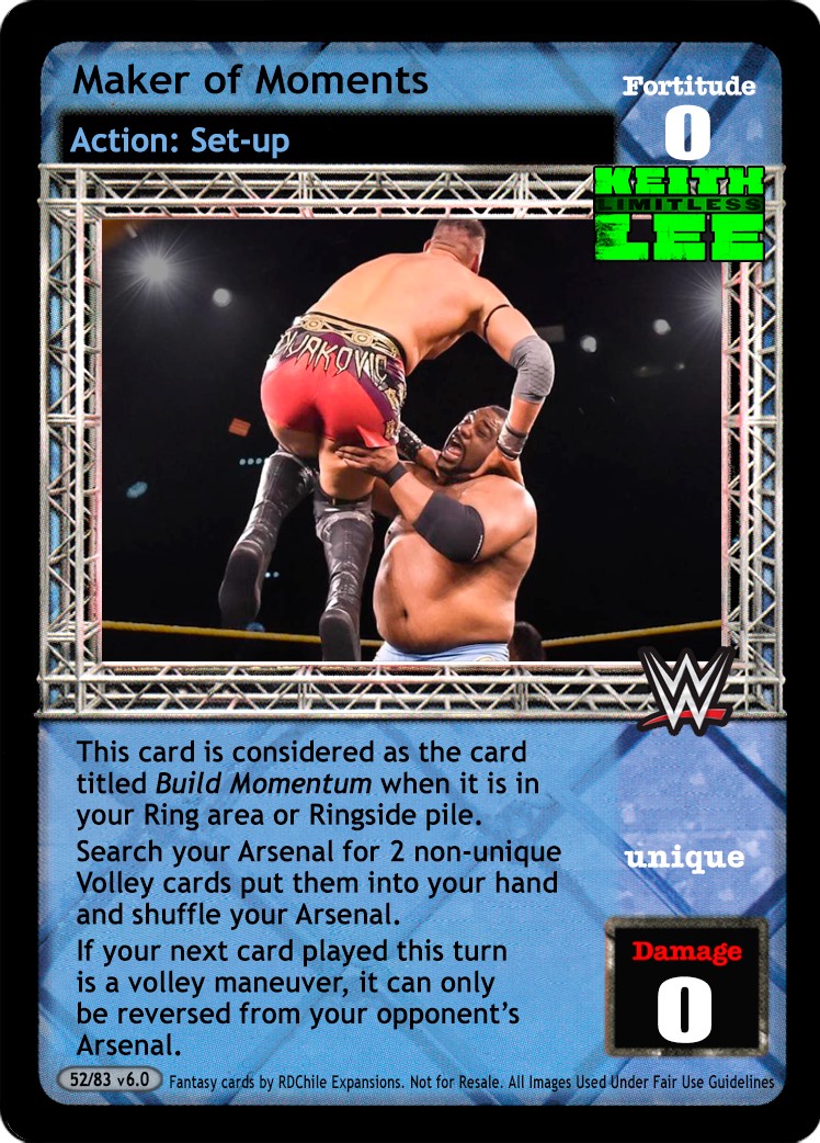 This card is considered as the card title “Build Momentum” when it is in your ring area or ringside pile. Search your arsenal for 2 non-unique volley cards put them into your hand and shuffle your arsenal. If your next card played this turn is a volley maneuver, it can only be reversed form your opponent`s arsenal