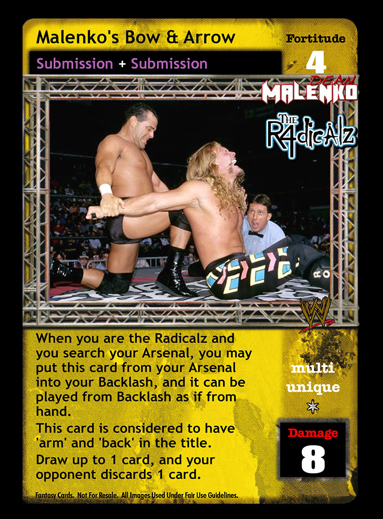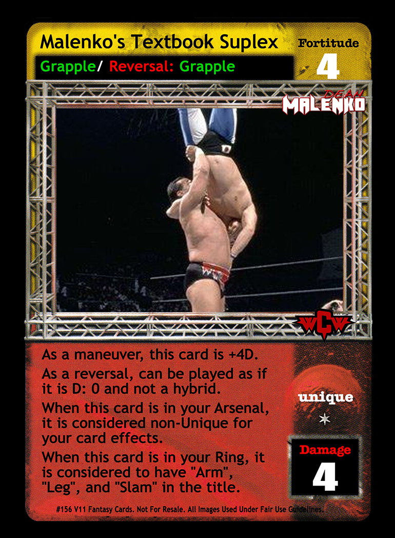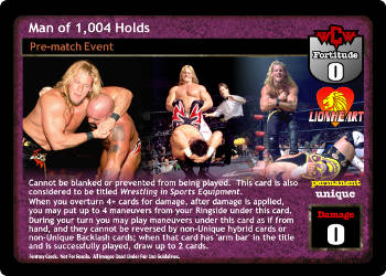Cannot be blanked or prevented from being played. This card is also considered to be titled Wrestling in Sports Equipment. When you overturn 4+ cards for damage, after damage is applied, you may put up to 4 maneuvers from your Ringside under this card. During your turn you may play maneuvers under this card as if from hand, and they cannot be reversed by non-Unique hybrid cards or non-Unique Backlash cards; when that card has 'arm bar' in the title and is successfully played, draw up to 2 cards.