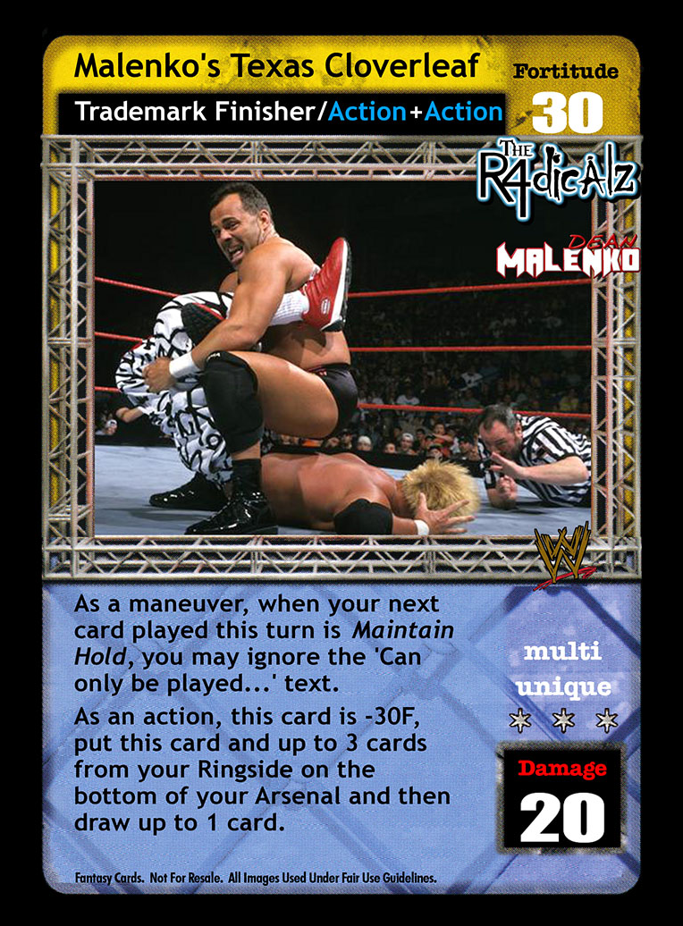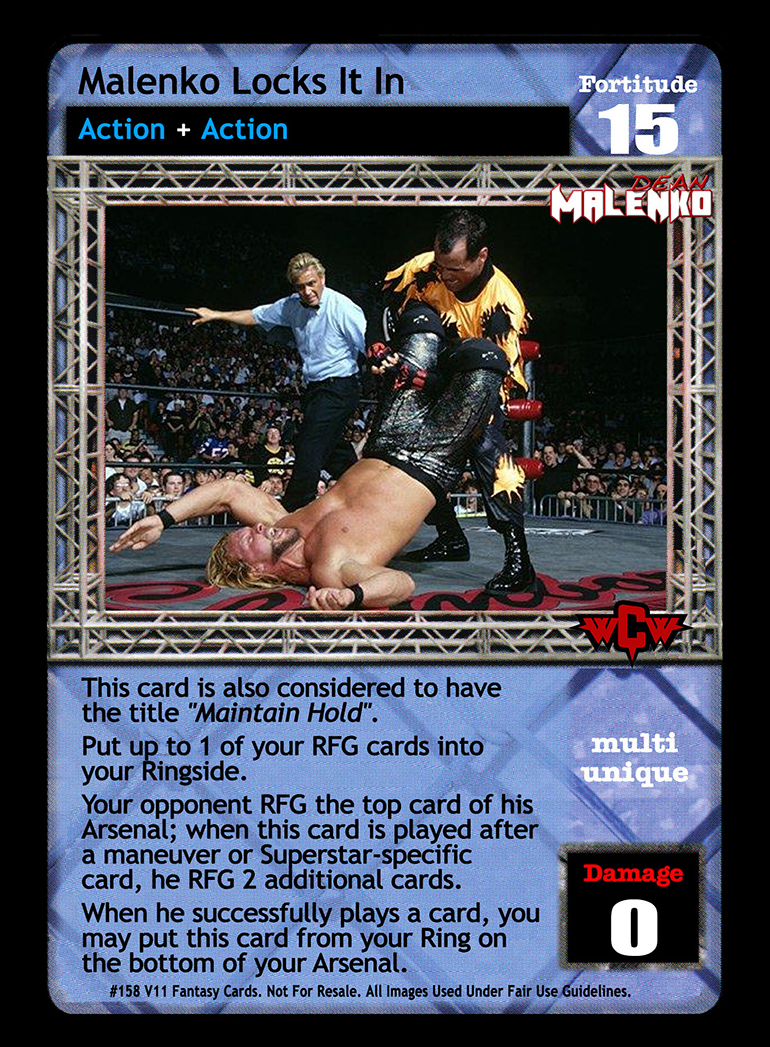 This card is also considered to have the title 'Maintain Hold'. Put up to 1 of your RFG cards into your Ringside. Your opponent RFG the top card of his Arsenal; when this card is played after a maneuver or Superstar-specific card, he RFG 2 additional cards. When he successfully plays a card, you may put this card from your Ring on the bottom of your Arsenal.