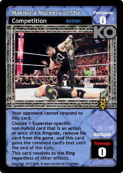 Your opponent cannot respond to this card. Choose 1 Superstar-specific non-hybrid card that is an action or antic in his Ringside, remove his card from the game, and this card gains the removed card's text until the end of the turn. This card resolves to the Ring regardless of other effects.