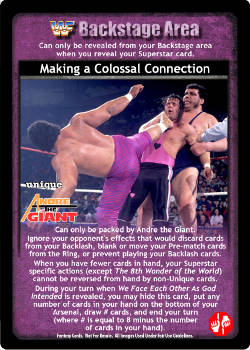 Can only be packed by Andre the Giant. Ignore your opponent's effects that would discard cards from your Backlash, blank or move your Pre-match cards from the Ring, or prevent playing your Backlash cards. When you have fewer cards in hand, your Superstar-specific actions (except The 8th Wonder of the World) cannot be reversed from hand by non-Unique cards. During your turn when We Face Each Other As God Intended is revealed, you may hide this card, put any number of cards in your hand on the bottom of your Arsenal, draw # cards, and end your turn (where # is equal to 8 minus the number of cards in your hand).