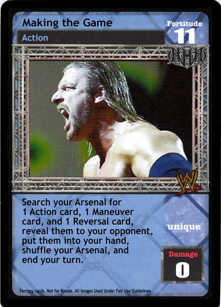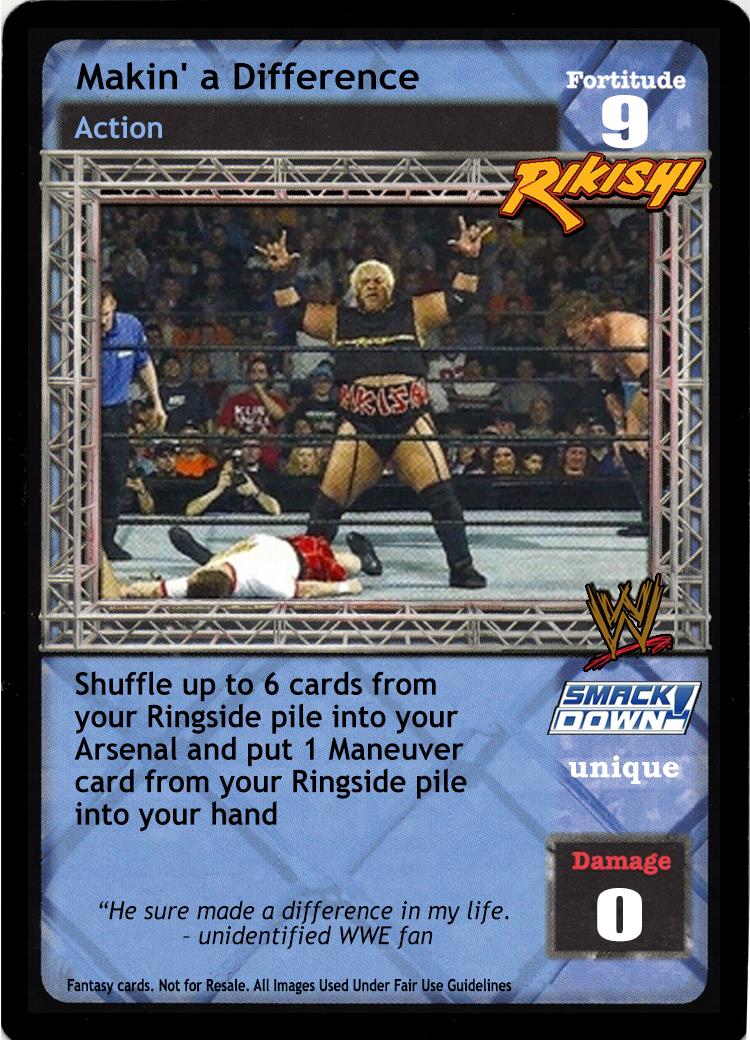 Shuffle up to 6 cards from your Ringside pile into your Arsenal and put 1 Maneuver card from your Ringside pile into your hand.