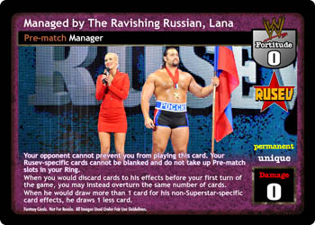 Your opponent cannot prevent you from playing this card. Your Rusev-specific cards cannot be blanked and do not take up Pre-match slots in your Ring. When you would discard cards to his effects before your first turn of the game, you may instead overturn the same number of cards. When he would draw more than 1 card for his non-Superstar-specific card effects, he draws 1 less card.