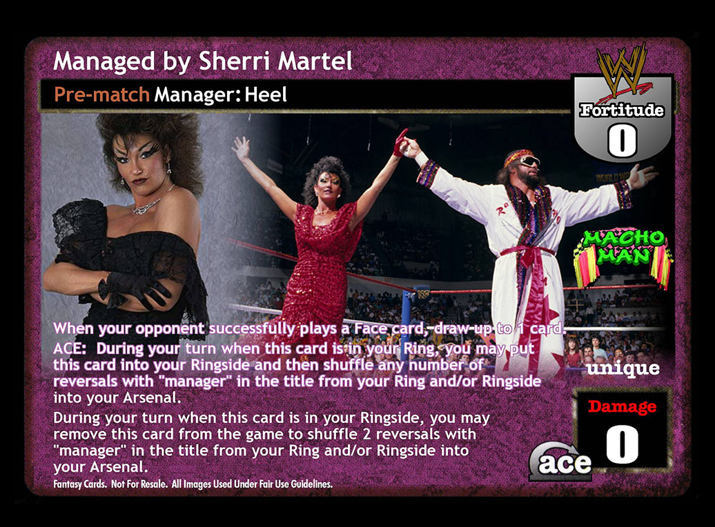 When your opponent successfully plays a Face card, draw up to 1 card. ACE: During your turn when this card is in your Ring, you may put this card into your Ringside and then shuffle any number of reversals with 'manager' in the title from your Ring and/or Ringside into your Arsenal. During your turn when this card is in your Ringside, you may remove this card from the game to shuffle 2 reversals with 'manager' in the title from your Ring and/or Ringside into your Arsenal.