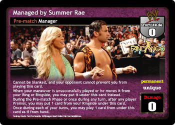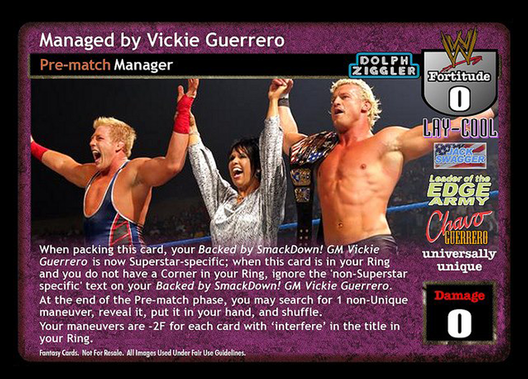 When packing this card, your Backed by SmackDown! GM Vickie Guerrero is now Superstar-specific; when this card is in your Ring and you do not have a Corner in your Ring, ignore the 'non-Superstar-specific' text on your Backed by SmackDown! GM Vickie Guerrero. At the end of the Pre-match phase, you may search for 1 non-Unique maneuver, reveal it, put it in your hand, and shuffle. Your maneuvers are -2F for each card with µinterfere' in the title in your Ring.