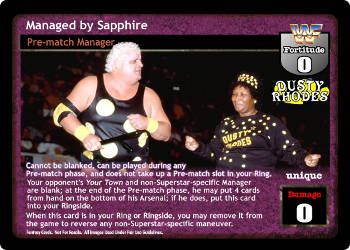 Cannot be blanked, can be played during any Pre-match phase, and does not take up a Pre-match slot in your Ring. Your opponent's 'Your Town' and non-Superstar-specific Manager are blank; at the end of the Pre-match phase, he may put 4 cards from hand on the bottom of his Arsenal; if he does, put this card into your Ringside. When this card is in your Ring or Ringside, you may remove it from the game to reverse any non-Superstar-specific maneuver.