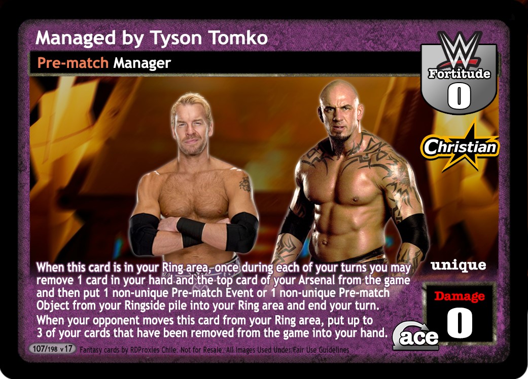 Cannot be blanked, and your opponent cannot prevent you from playing this card. When your maneuver is unsuccessfully played or he moves it from your Ring or Ringside, you may put it under this card instead. During the Pre-match Phase or once during any turn, after any player Promos, you may put 1 card from your Ringside under this card. Once during each of your turns, you may play 1 card from under this card as if from hand.