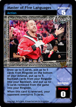 Draw up to 5 cards, put up to 5 cards from Ringside on the bottom of your Arsenal, put up to 5 Backlash cards from your Ringside into your Backlash, and put up to 5 cards removed from the game into your Ringside. When this card is reversed, your opponent overturns 5 cards.