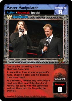 Can only be packed by a GM or Chairman Superstar. As an action, look at your opponent's hand, choose 1 card, and he discards the chosen card. As a reversal, reverse any non-Unique card, and then search his hand and Arsenal for cards with the same title and put them into his Ringside; he shuffles.