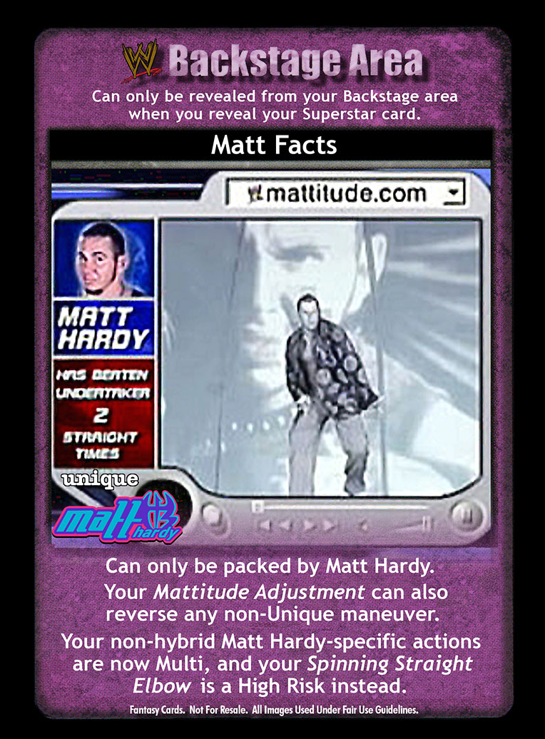Can only be packed by Matt Hardy. Your Mattitude Adjustment can also reverse any non-Unique maneuver. Your non-hybrid Matt Hardy-specific actions are now Multi, and your Spinning Straight Elbow is a High Risk instead.