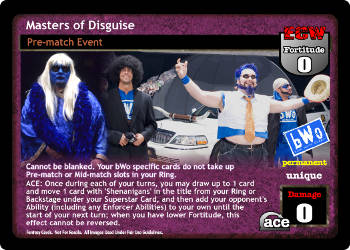 Cannot be blanked. Your bWo specific cards do not take up Pre-match or Mid-match slots in your Ring. ACE: Once during each of your turns, you may draw up to 1 card and move 1 card with 'Shenanigans' in the title from your Ring or Backstage under your Superstar Card, and then add your opponent's Ability (including any Enforcer Abilities) to your own until the start of your next turn; when you have lower Fortitude, this effect cannot be reversed.