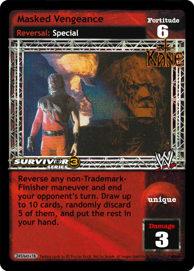 Reverse any non-Trademark-Finisher maneuver and end your opponent's turn. Draw up to 10 cards, randomly discard 5 of them, and put the rest in your hand.