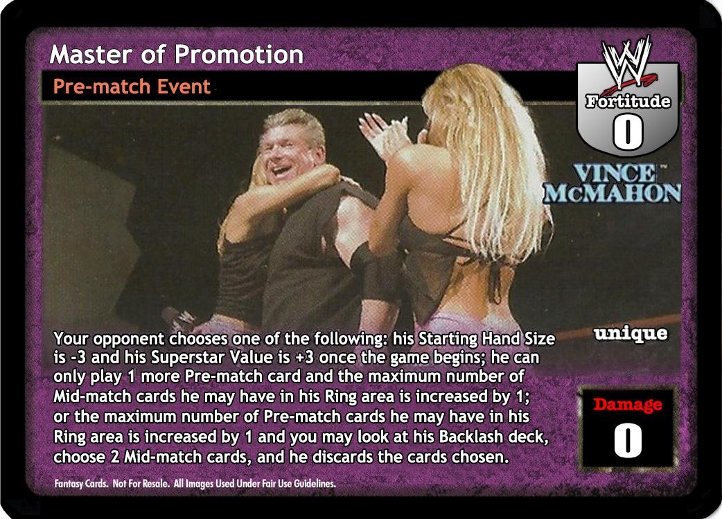 Your opponent chooses one of the following: his Starting Hand Size is -3 and his Superstar Value is +3 once the game begins; he can only play 1 more Pre-match card and the maximum number of Mid-match cards he may have in his Ring area is increased by 1; or the maximum number of Pre-match cards he may have in his Ring area is increased by 1 and you may look at his Backlash deck, choose 2 Mid-match cards, and he discards the cards chosen.