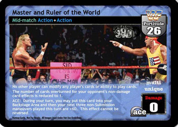 No other player can modify any player's cards or ability to play cards.The number of cards overturned for your opponent's non-damage card effects is reduced to 1. ACE: During your turn, you may put this card into your Backstage Area and then your next three non-Submission maneuvers played this turn are +6D. This effect cannot be reversed.