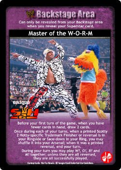 Before your first turn of the game, when you have fewer cards in hand, draw 2 cards. Once during each of your turns, when a printed Scotty 2 Hotty-specific Trademark Finisher or reversal is in your Ringside or face-down in your Ring, you may shuffle it into your Arsenal; when it was a printed reversal, end your turn. During your turn you may play W!, O!, R! and M! together; unless they are all reversed, they are all successfully played.