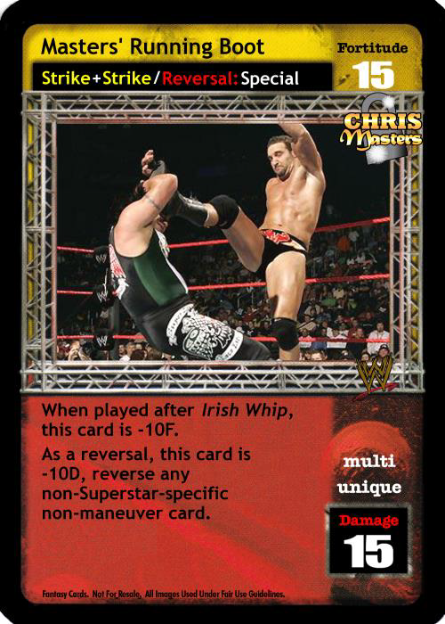 When played after Irish Whip, this card is -10F. As a reversal, this card is -10D, reverse any non-Superstar-specific non-maneuver card.