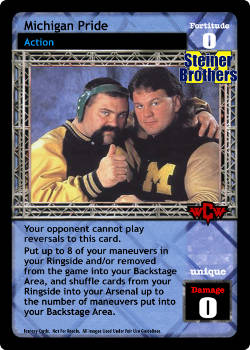 Your opponent cannot play reversals to this card. Put up to 8 of your maneuvers in your Ringside or removed from the game into your Backstage Area, and shuffle cards from your Ringside into your Arsenal up to the number of maneuvers put into your Backstage Area.