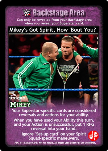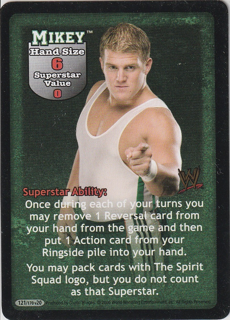 Once during each of your turns you may remove 1 Reversal card in your hand from the game and then put 1 Action card from your Ringside pile into your hand. You may pack cards with The Spirit Squad logo, but you do not count as that Superstar.