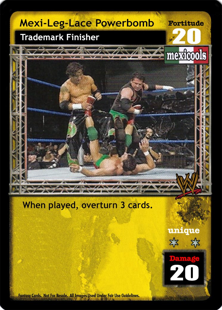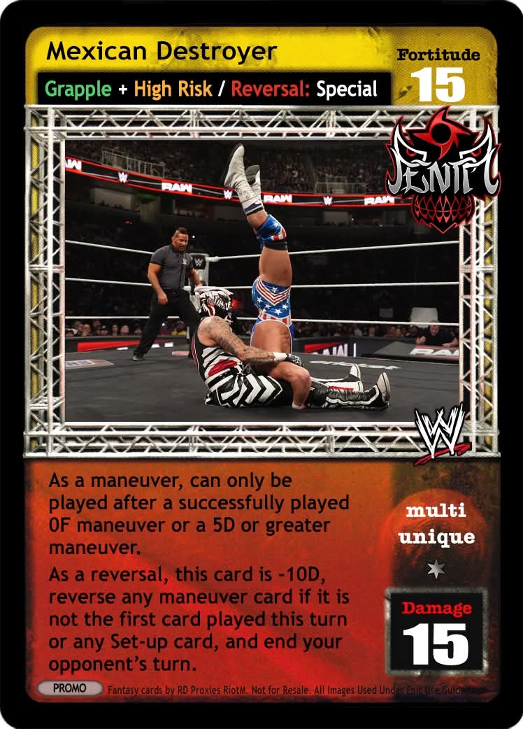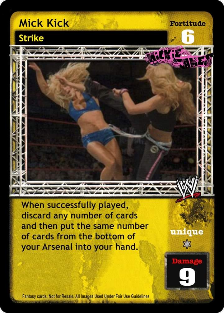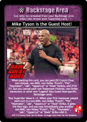 When packing this card, you can pack DX Crotch Chop, non-Unique, non-RMS, non-Volley 'Punch', 'Fist', 'Haymaker', 'Jab', 'Uppercut', or 'Hook' Strikes, and S*CK IT!, but you cannot pack non-Trademark Finisher, non-Strike maneuvers or other non-'Legend' Raw Guest Host-specific Backstage cards. Your Superstar Value is +3. When your first maneuver played each turn is a non-RMS, non-Volley 'Punch', 'Fist', 'Haymaker', 'Jab', 'Uppercut', or 'Hook' Strike, it gains the Raw logo, and you may immediately play another non-RMS, non-Volley 'Punch', 'Fist', 'Haymaker', 'Jab', 'Uppercut', or 'Hook' Strike with it.