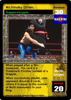 When played after a 5D+ maneuver, it is a Trademark Finisher instead of a Grapple. When successfully played, your opponent discards # cards, where # is equal to the number of Multi maneuvers in your Ring.
