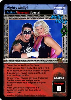 Cannot be packed by a Tag Team. When you are Molly Holly, this card is F: 0. As an action, search your Arsenal for up to 3 maneuvers, reveal them, put them in your hand and shuffle. As a reversal, reverse any non-Trademark Finisher maneuver and put up to 1 maneuver from your Ringside into your hand. When your next card played is a maneuver, ignore the 'Can only be played...' text.