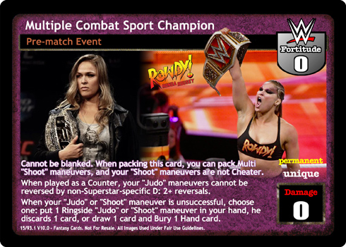 Cannot be blanked. When packing this card, you can pack Multi maneuvers with 'shoot' in the title as if you are a Male Superstar. Your maneuvers with 'shoot' in the title are not Cheater. When played as a Counter, your maneuvers with 'judo' in the title cannot be reversed by non-Superstar-specific D:2+ reversals. When your maneuver with 'judo' or 'shoot' in the title is unsuccessful, choose one: put 1 other maneuver with 'judo' or 'shoot' in the title from your Ringside to your hand, he discards 1 card, or draw 1 card and put 1 card from your hand on the bottom of your Arsenal.