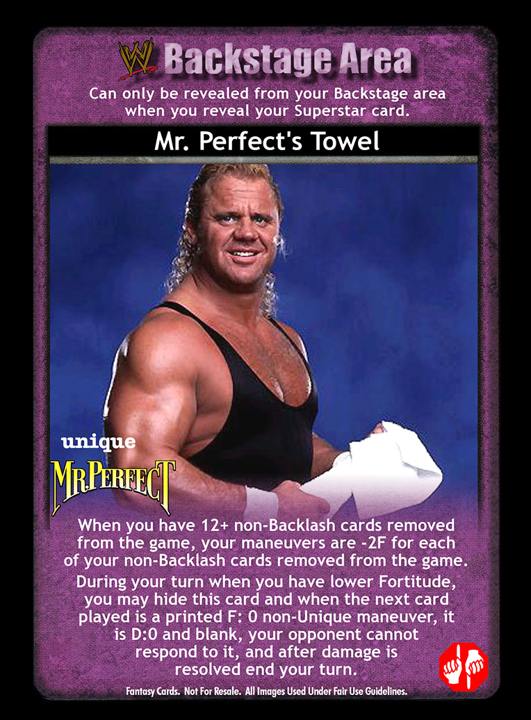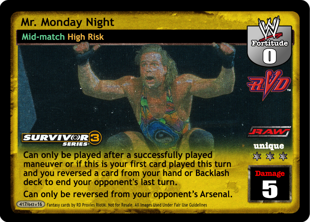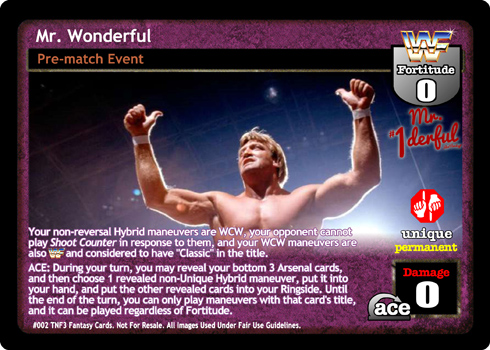 Your non-reversal Hybrid maneuvers are WCW, your opponent cannot play Shoot Counter in response to them, and your WCW maneuvers are also [Classic WWF Logo] and considered to have 'Classic' in the title. ACE: During your turn, you may reveal your bottom 3 Arsenal cards, and then choose 1 revealed non-Unique Hybrid maneuver, put it into your hand, and put the other revealed cards into your Ringside. You cannot play non-maneuver cards with titles different from the chosen card's title for the rest of the turn, and it can be played regardless of Fortitude.