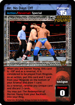 When you are Darren Young, this card is -10F and as a reversal, it is considered to be played from Ringside. As an action, put this card and 1 card from your Ringside on the bottom of your Arsenal and draw 1 card. As a reversal, reverse any Unique card and discard 2 cards. You may put The Redemption of Darren Young from your Backlash into your Ring.
