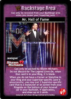 Can only be packed by Shawn Michaels. Do not discard for The Legend Lives On, when that card is in your Ring, it is blank. When you do not have a Corner or Storyline in your Ring and your Superstar-specific card is unsuccessful, you may put 1 Superstar-specific card that is a maneuver or an action from your Ringside on the bottom of your Arsenal (or in your Backlash, if applicable), and draw up to 2 cards.